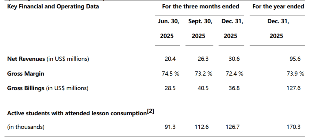 - Active students with attended lesson consumption reached 170,300 for full year 2025, up 79.3% from 95,000 in 2024; Q4 active students totaled approximately 126,700, up 70.8% YoY