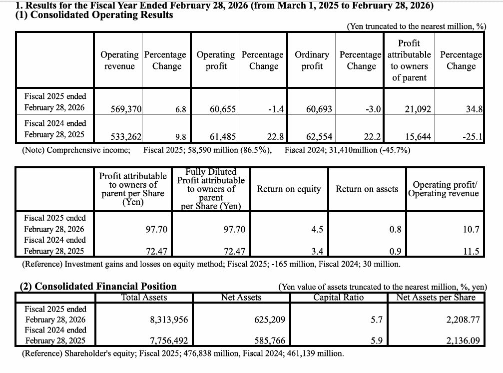 Ordinary income~¥60.69 billionDown about 3% year on year; no market consensus figures in the release.