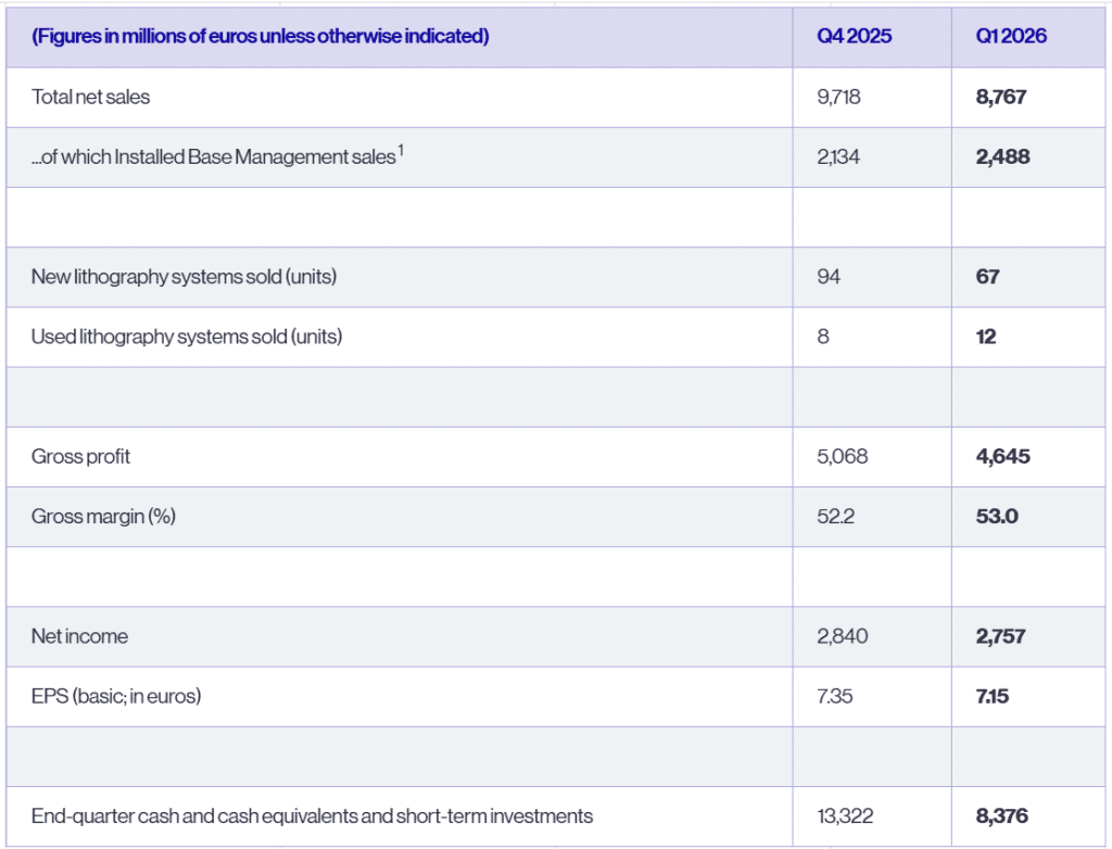 “For the quarter, total net sales came in at EUR 8.8 billion. That was within guidance. Included in the EUR 8.8 billion was EUR 2.5 billion for installed base revenue. That was a little bit above the guidance. If you look at the gross margin for Q1, 53%, that was at the high end of the gross margin that we guided.” – Roger Dassen, Chief Financial Officer, ASML
