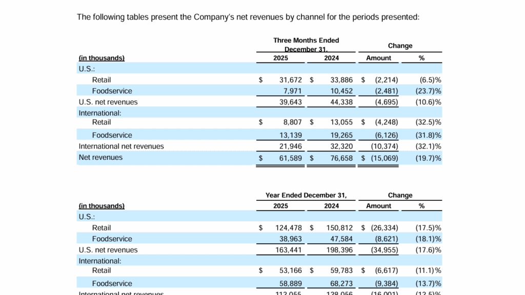 “We entered a challenging year for our brand with an equally challenging quarter. Financial results for the fourth quarter 2025 reflect persistent weak demand in the plant-based meat category, resulting in lower volumes, the impact of which rippled throughout our P&L. This negative pressure was coupled with a number of significant non-routine charges, many of which, though not all, stem from our transformation activities.”