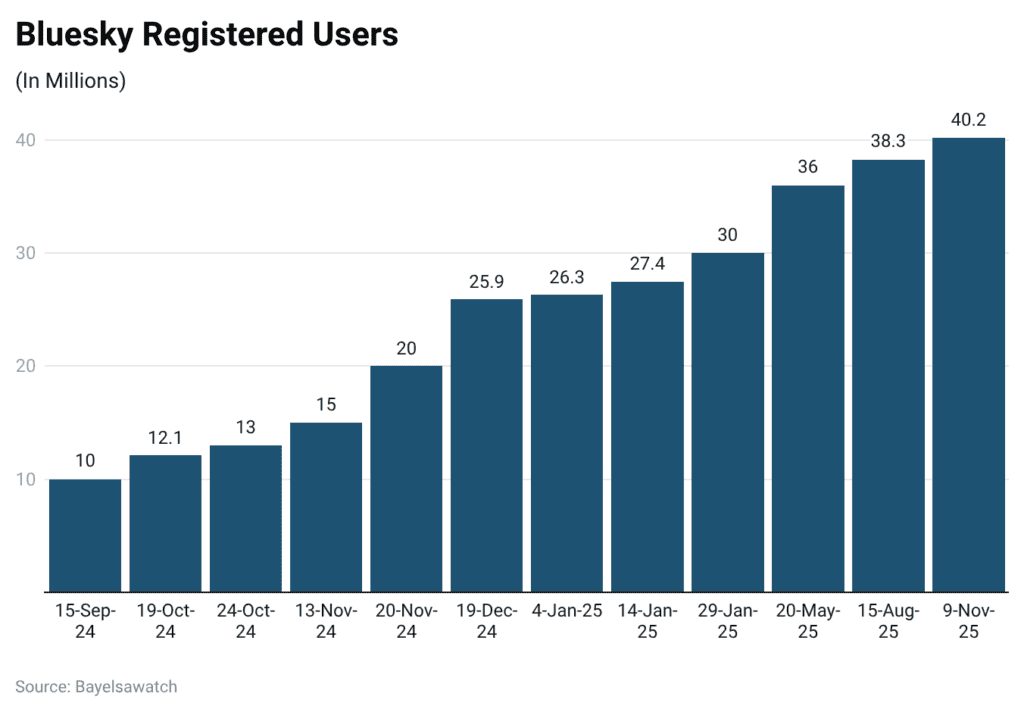 - Bluesky exceeded 40.2 million registered users by November 2025 after reaching 10 million users in September 2024.