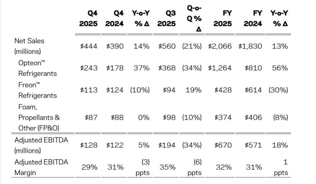 “We are pleased with the robust cash flow generated and the ability to drive sales performance within our expectations. Net sales met expectations largely due to TSS achieving record sales, driven by continued strong Opteon adoption and consistent commercial performance across all divisions… We’re really proud of both the execution on the Opteon side and Freon side in 2025, and we’ll continue to execute and grow in both next year.”