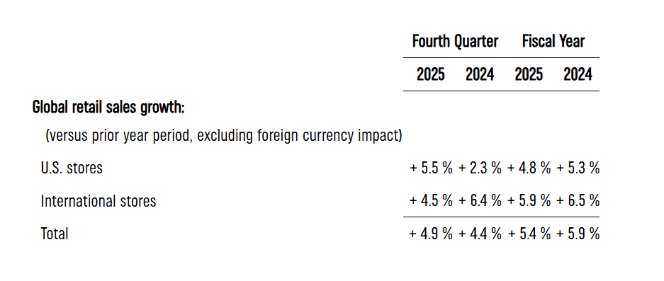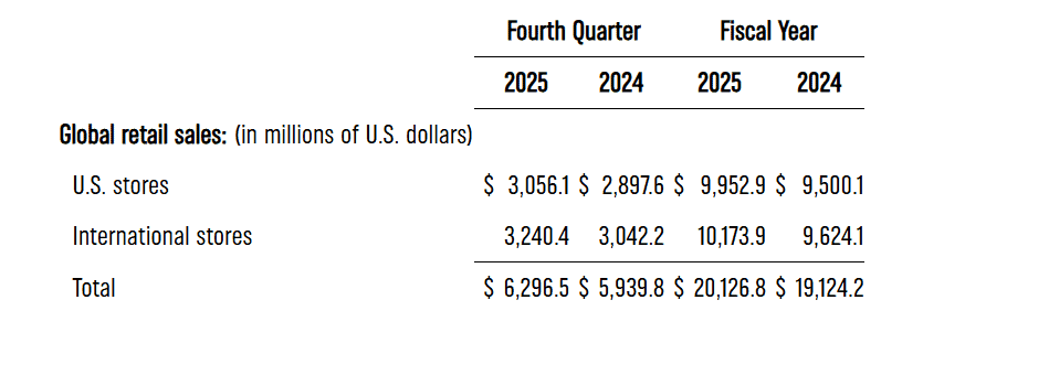- Total global retail sales grew 5.4% in fiscal year 2025, versus 5.9% in fiscal year 2024.