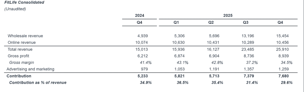 - Q4 2025 wholesale revenue reached $15.5 million (about 60% of total), more than tripling from $4.9 million a year earlier.