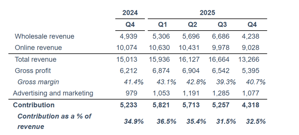 - Q4 2025 online revenue was $10.5 million (about 40% of total), up 4% year over year.