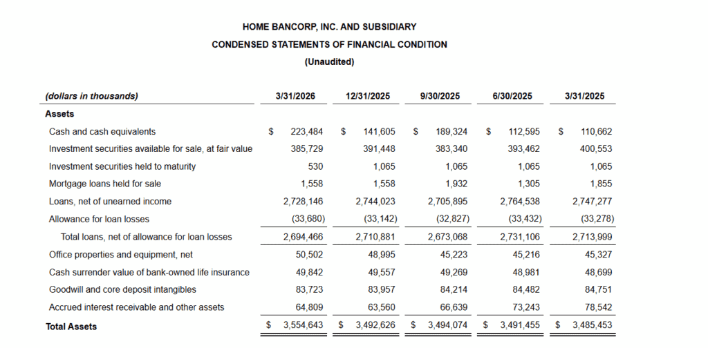 Competitor-specific Q1 2026 earnings data for CCNE, CTBI, FFBC, and GSBC were not yet publicly available at time of publication. The table above reflects Home Bancorp’s own performance trend, which serves as a benchmark relative to sector norms. Home Bancorp’s NIM of 4.16% and ROA of 1.30% compare favorably to small-cap community bank averages, while its efficiency ratio of 60.02% signals well-controlled overhead.