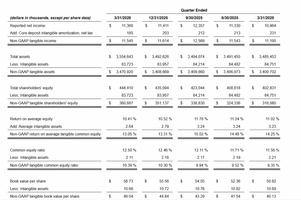 - Total loans stood at $2.73 billion, down $15.9 million (0.6%) from Q4 2025, reflecting softer loan production