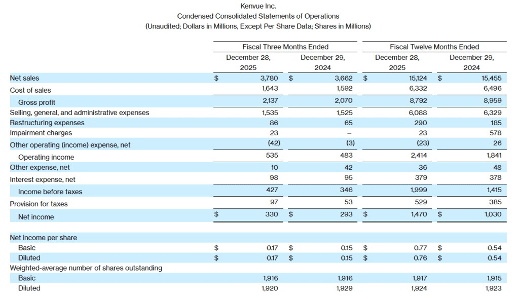 Kenvue (NYSE: KVUE) beat Wall Street estimates for Q4 2025, posting adjusted EPS of $0.27 vs. the consensus $0.22 – a 22.7% upside surprise. Revenue of $3.78 billion topped the $3.68 billion estimate, rising 3.2% year-over-year. Full-year adjusted EPS was $1.08, down from $1.14 in FY 2024, while net sales declined 2.1% to $15.12 billion. The company announced a 3.5% global workforce reduction (~770 jobs) ahead of its pending $48.7 billion acquisition by Kimberly-Clark, and will not provide forward-looking guidance.