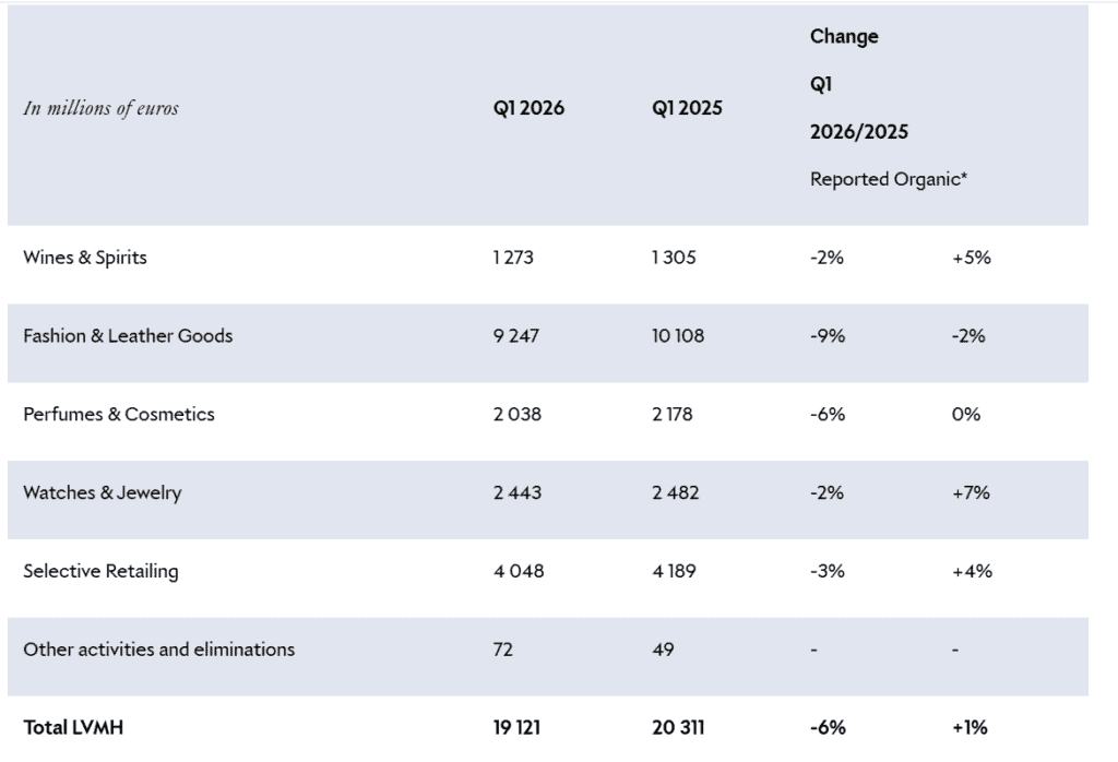 | LVMH | Q1 2026 | €19.1 bn | About +1% organic, pressured fashion segment |