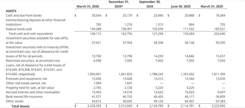 Recent filings highlight improving net interest margin and disciplined expense management following a challenging 2024 that included a nonrecurring software impairment. Public sources summarizing Q1 2026 mention net income of $4.1 million and EPS of $0.48, but do not provide current market cap, P/E ratio, dividend yield, or employee count, so those metrics cannot be reliably stated from the accessible data.