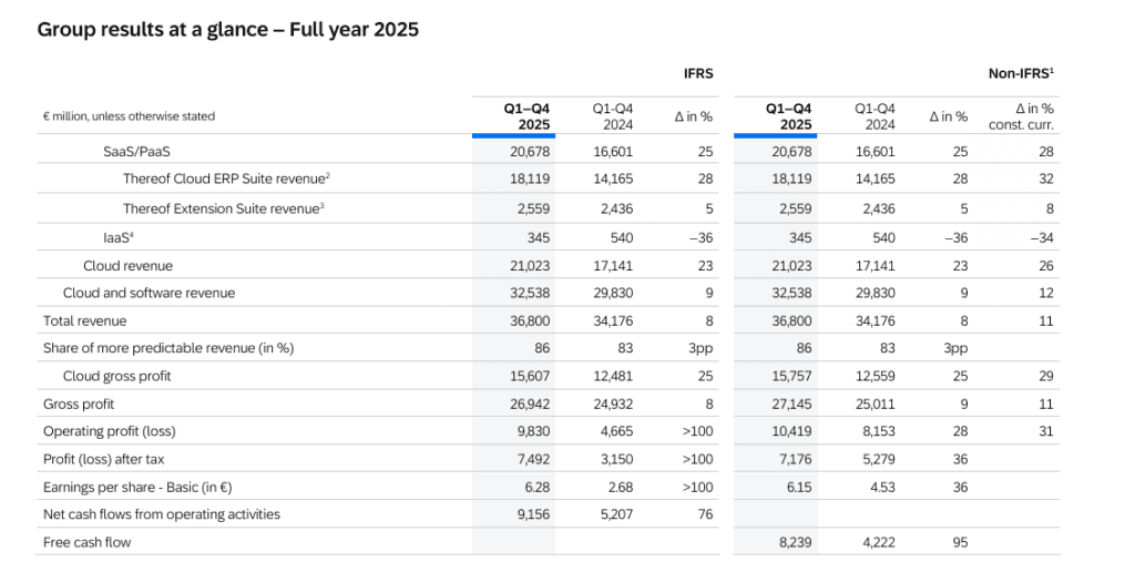 Dominik Asam, CFO: “We closed 2025 on a high note, delivering strong operating profit and free cash flow ahead of our expectations. This performance reflects focused execution, financial discipline, and the continued trust our customers place in us as the North Star for their digital transformation. As evidenced by continued strong growth well ahead of the market in SaaS and PaaS, and our ability to bring such growth down to the bottom line and Free Cash Flow, we are confident that our strategy and operational discipline will continue to drive long-term value creation.”