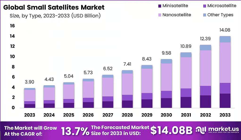 - Small Satellites Market is poised to see significant growth with a projected CAGR of 13.7% between 2024 to 2033. Its market size has been projected to grow to USD 14.08 billion by 2033.