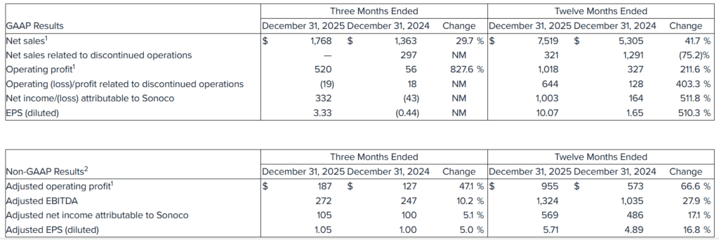 Sonoco (SON) posted Q4 adjusted EPS of $1.05, beating the consensus estimate of $1.00 by 5%. Revenue surged 29.7% year-over-year to $1.77 billion, topping expectations by approximately $10 million, driven primarily by the Eviosys acquisition. Shares closed at $51.67 on the last trading day before the announcement (Feb 13), up ~18.4% year-to-date, with the earnings release arriving on Sunday, February 16, ahead of the company’s New York Investor Day on February 17.