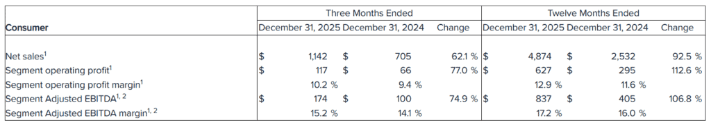 - Consumer Packaging Segment (Q4): Record sales of $1.14 billion (+62.1%), adjusted EBITDA of $174 million (+74.9%), with EBITDA margin expanding by 110 bps to 15.2%.
