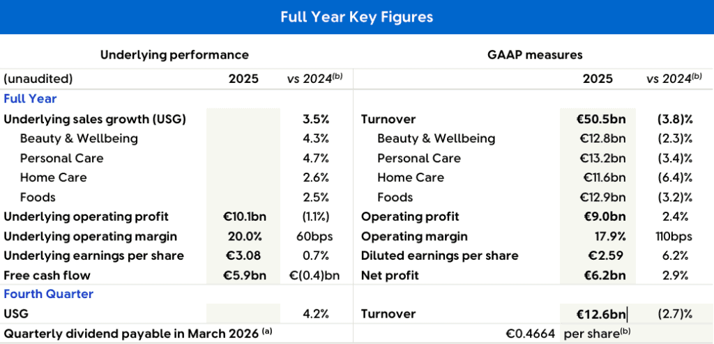 - Underlying sales growth stood at 3.5% for the full year, comprising 1.5% volume growth and 2.0% price growth, with Q4 accelerating to 4.2%, supported by 2.1% volume and 2.0% price growth.