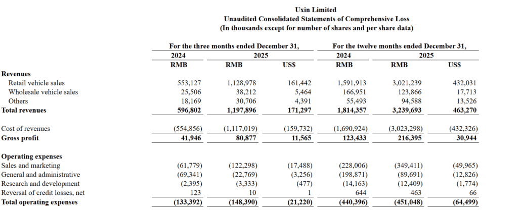 Uxin Limited delivered Q4 2025 revenue of RMB 1,197.9 million, roughly doubling year over year, while full year revenue rose to RMB 3.24 billion. The company still posted a net loss of around RMB 262–278 million for 2025, though losses narrowed versus 2024, and adjusted EBITDA improved. Shares traded higher in premarket action, rising about 3.6% as investors reacted to robust volume and revenue growth despite margin pressure and liquidity concerns.